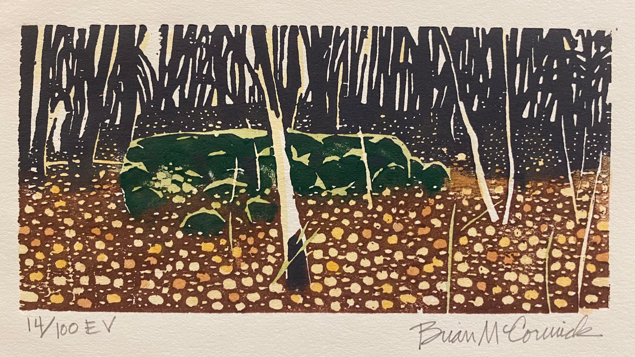 This woodblock print with added watercolor was handmade by Brian McCormick of Madison, Wisconsin.