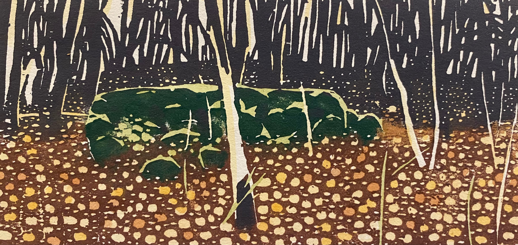 His works are inspired by nature, particularly of the rolling hills of the Driftless Region. While Brian has always been drawn to watercolor, he recently began making woodblock prints. Using wood scraps, he carves out a design, creating a relief printing block. He then inks the block, press paper against it, and rub the back using a "baren". Brian dreams of having a beautiful Japanese baren but for now, he uses an old wood cabinet knob as his baren.