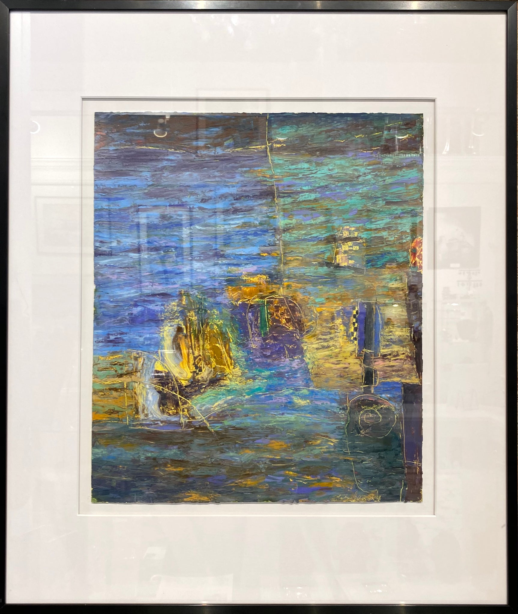 This abstract oil, acrylic and wax painting on paper was handmade by Thomas Jewell-Vitale of Dubuque, Iowa.