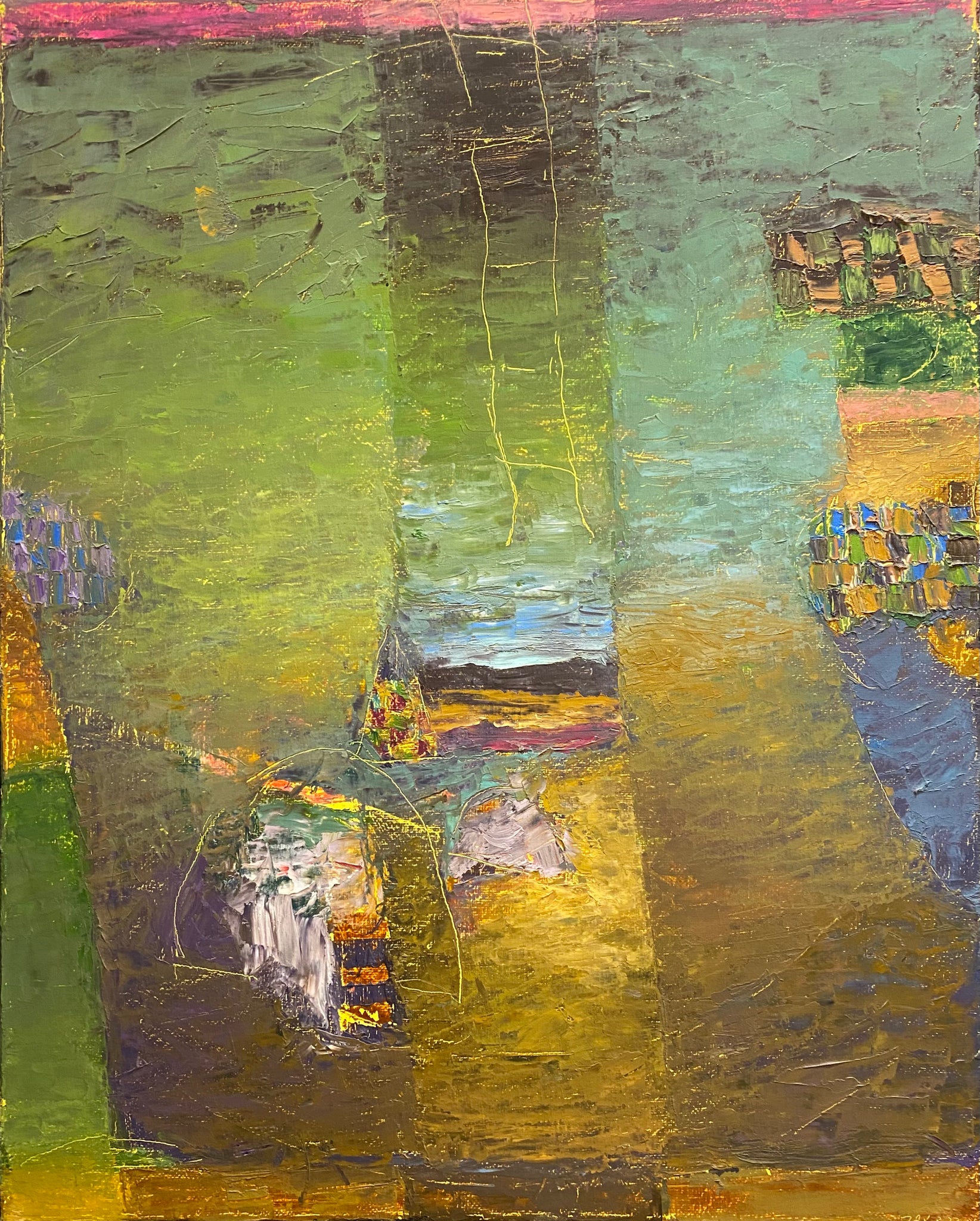 This abstract oil, acrylic, and wax painting was handmade by Thomas Jewell-Vitale of Dubuque, Iowa.