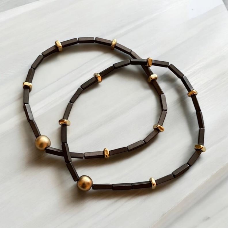 These bracelets are so beautiful... Stack as many colors you like! They are hand beaded on elastic with electroplated hematite tube beads and 14k gold plated beads.