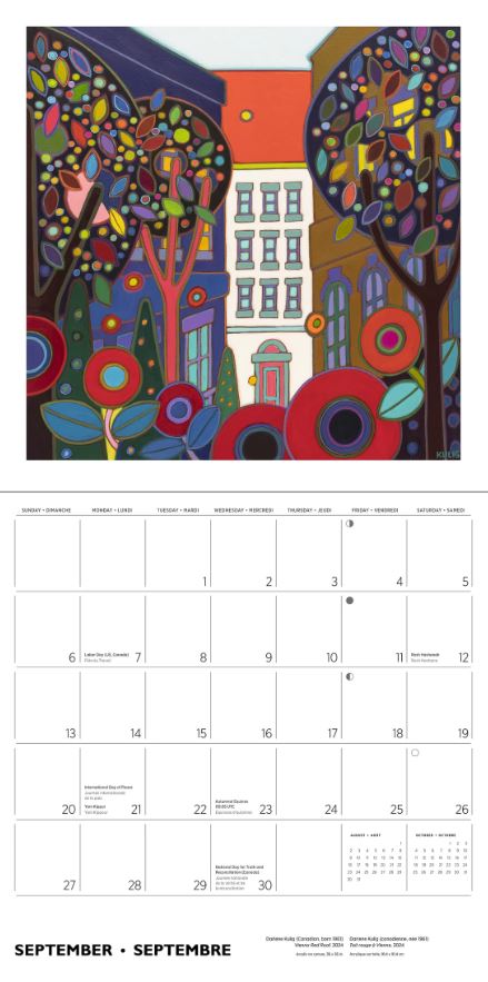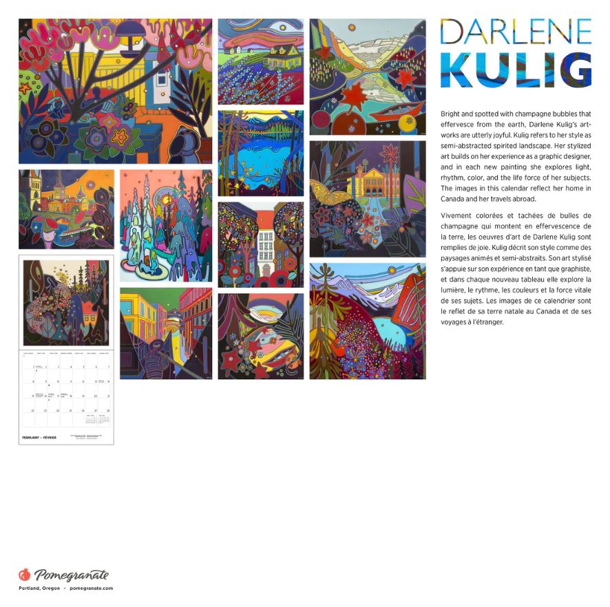 Bright and spotted with champagne bubbles that effervesce from the earth, Darlene Kulig’s artworks are utterly joyful. Kulig refers to her style as semi-abstracted spirited landscape. Her stylized art builds on her experience as a graphic designer, and in each new painting she explores light, rhythm, color, and the life force of her subjects. The images in this calendar reflect her home in Canada and her travels abroad.