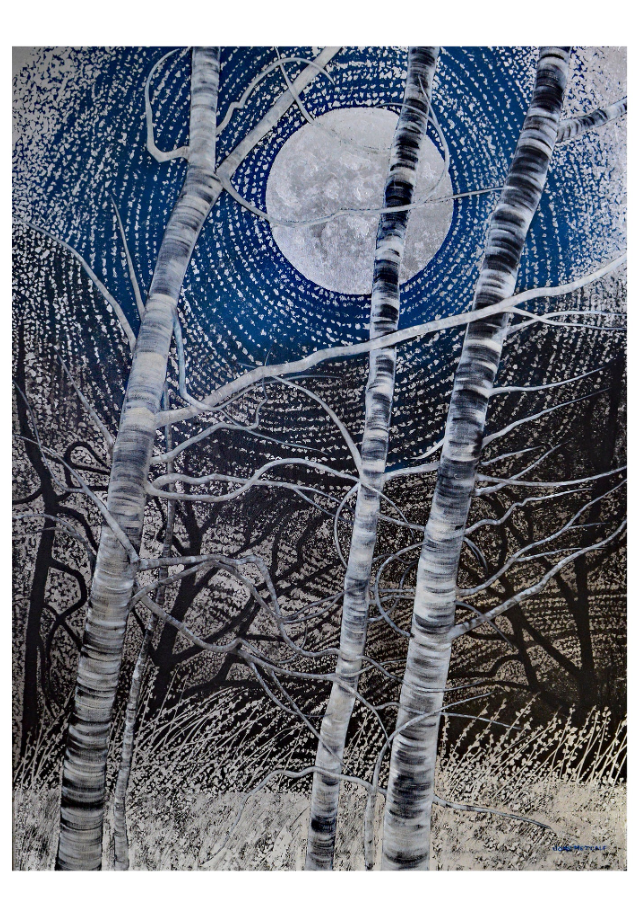While layers of metal leaf lend a literal shimmer, Joan Metcalf’s oil paintings shine with a beauty and elegance all their own. Metcalf finds inspiration in the gorgeous landscapes of the Pacific Northwest to create dynamic, large-scale scenes—from the dazzle of aspen trees to the glow of lunar energy.
