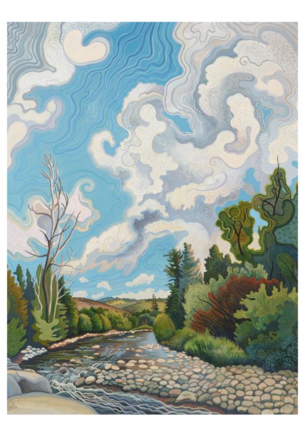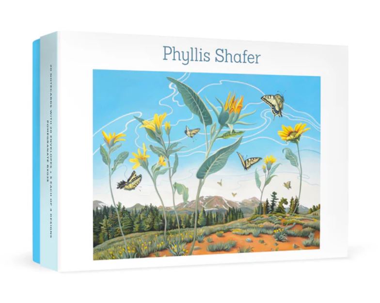 American plein air painter Phyllis Shafer attempts to reveal the rhythms and transcendental essence of nature through her landscape paintings. Inspired by the Lake Tahoe wilderness near her home, the Arizona deserts, and the majesty of national parks and forests, her scenes come to life with vibrant color palettes and stylized brushstrokes that bestow movement into seemingly still environments. Absorbing her unique point of view and flowing linework, the viewer of Shafer’s paintings can almost feel the breeze in their hair or the warmth of the sun on their skin. Let this set of four images carry you to a babbling brook, take on the perspective of a waltzing butterfly, or even provoke a moonlit adventure. Contains five each of the following notecards: Curious Clouds Surprised the Sky, 2019, Her Little Parasol to Lift, 2019, Swallowtail Dance, 2018, Moonrise over Stevens Peak, 2022.
