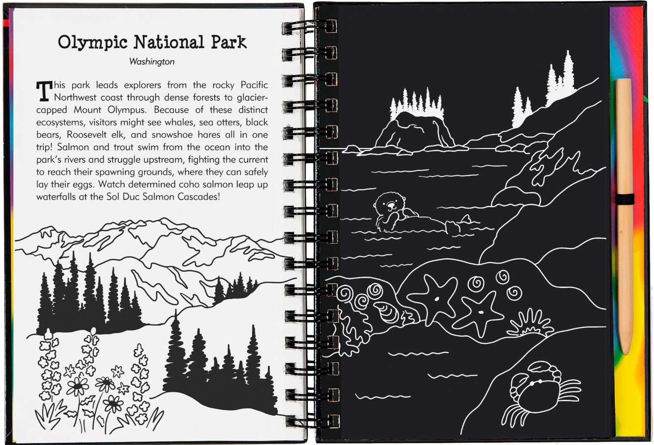 Scratch off the white outlines to bring each scene to life in swirling colors or gleaming foil. Get acquainted with parks and landmarks across America, from the ocean cliffs of Maine's Acadia National Park to the mighty redwoods of California, from Hawaiian volcanoes to the colossal presidential figures of Mount Rushmore.