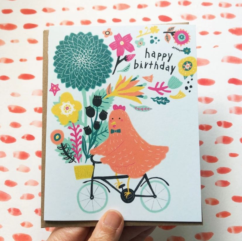 Chicken on Bicycle Birthday Greeting Card by Honeyberry Studios