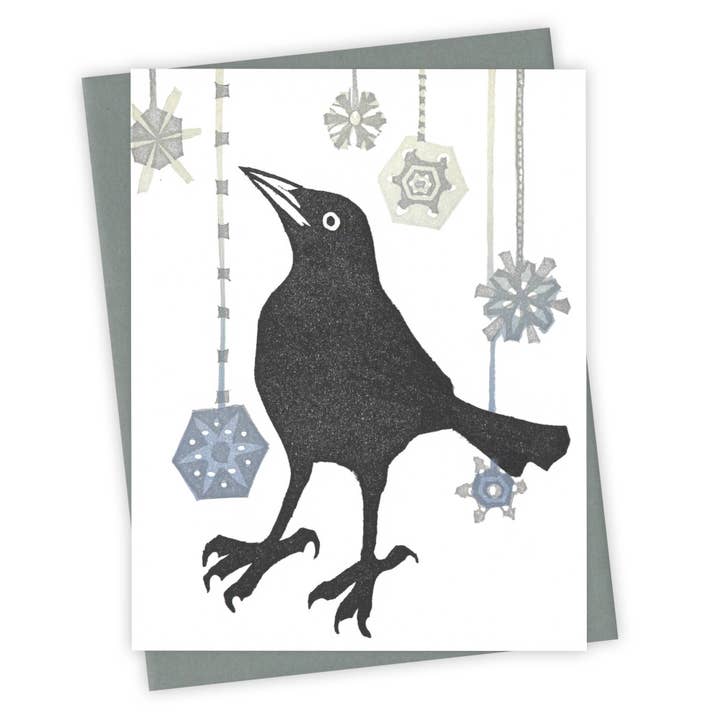 Original block print folded card on 100% cotton paper featuring a hand-carved, letterpress-printed grackle marveling at the seasonal decorations.