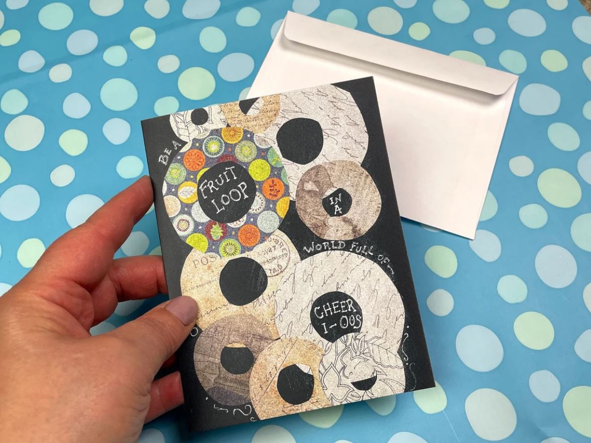 This greeting card features an image from an original collage by Lori Biwer-Stewart of Osage, Iowa.