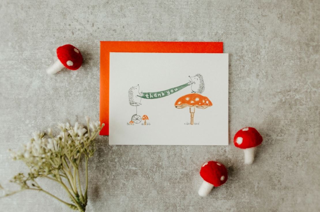 This adorable pair of hedgehogs are holding a 'thank you' banner. One hedgie is standing on a mushroom, the other is on a unicycle.