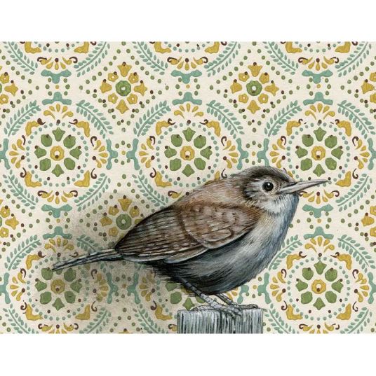 I started out painting room scenes with overlapping patterns, bold colors, human figures, and moody lighting. My body of work now focuses in on the small spaces within those rooms — revealing what is hiding out on the ornate walls. Birds, plants, and larger-than-life insects are my primary muses.