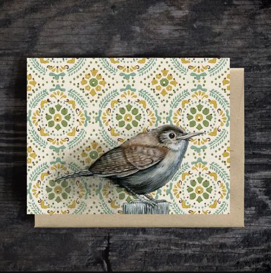 This 4.25" x 5.5" blank card features an image from an original oil painting on wallpaper by Emily Uchytil of Wild Wallflowers in Parkville, Maryland. The card is printed on textured, recycled paper at a local, wind-powered print shop and includes a coordinating brown A2 envelope. Comes in a compostable acetate sleeve.