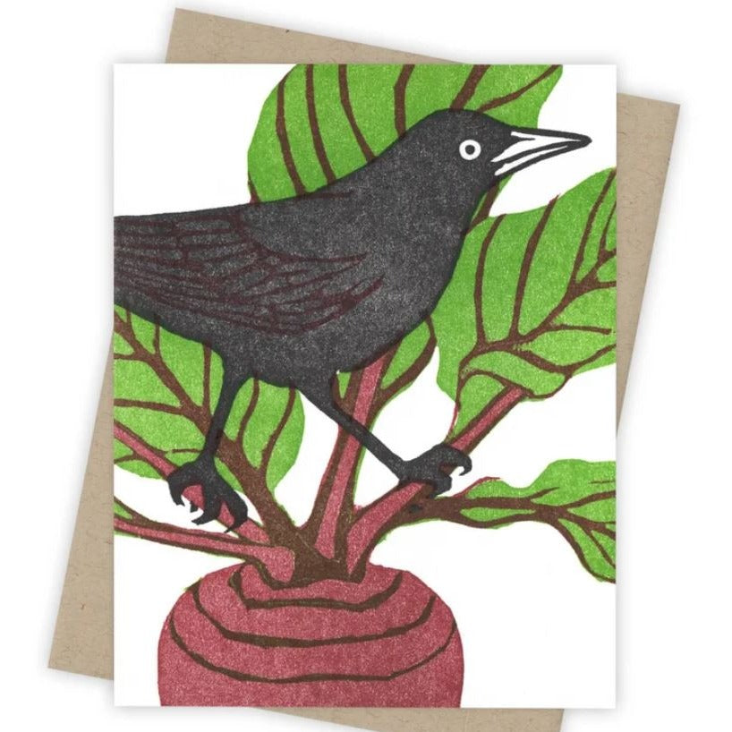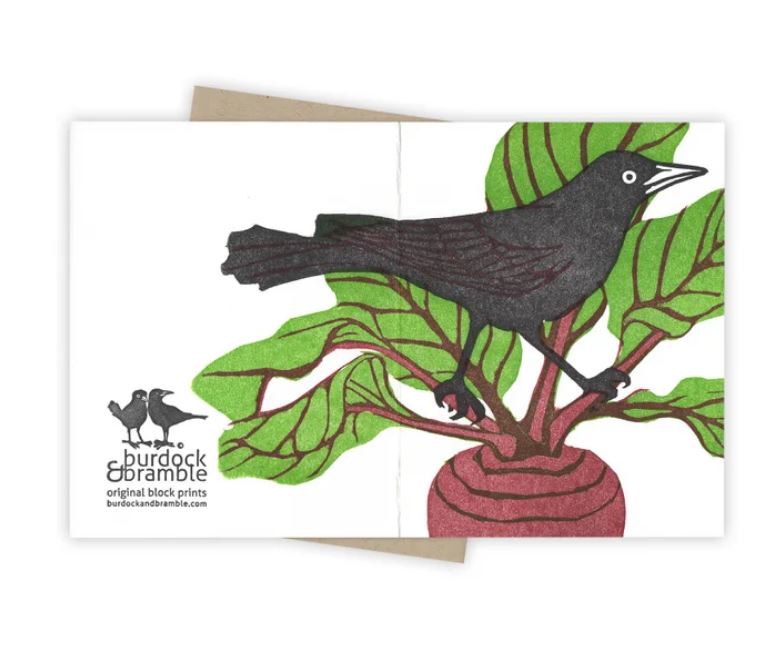 Original blank block print, folded card on 100% cotton paper featuring a hand-carved, letterpress-printed grackle in the garden striding through the red beets and green leaves.