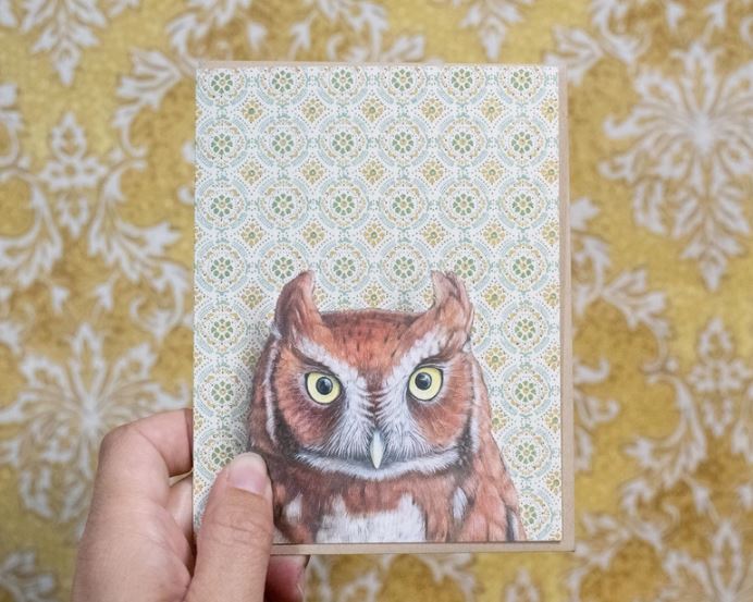Emily Uchytil is an oil painter who focuses on creating ecologically themed paintings on vintage wallpaper. Reproductions of her original oil paintings are printed in her studio with professional matte paper and archival ink and all note cards are printed on recycled paper at a local, wind-powered print shop.
