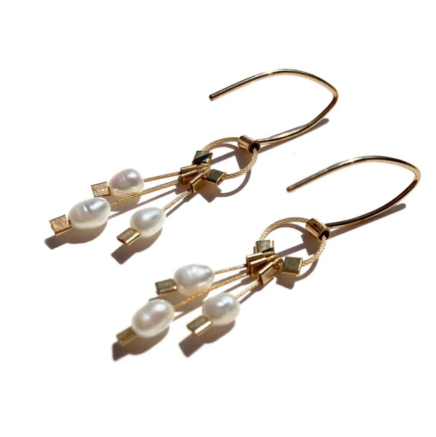 Flexible, light woven stainless steel mini cable finished with nylon for a smooth feel. Each piece is hand-finished with little accents of sterling silver and/or 14k gold-filled as well as a choice of semi-precious stones. Posts or hooks are 14k gold filled or sterling silver. Hypoallergenic materials. Travel-Friendly with metal memory (the pieces are collapsible and can return to shape after a crushing).