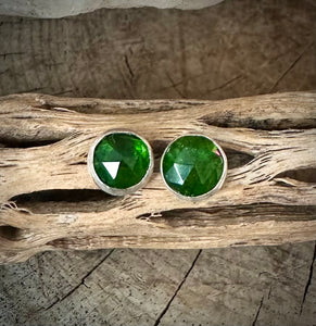 Rose cut chrome diopside stones dazzle from within their bezel set sterling posts.