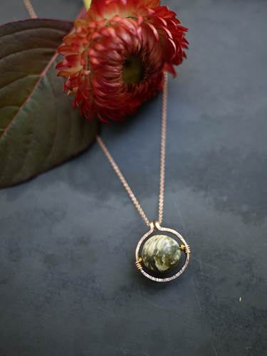 This necklace is made of a hammered metal circular frame featuring a gorgeous matte Peruvian Opal bead suspended at the center. The central bead is framed by tiny hematite beads. The wire has portions that are hammered to give the pendant a unique combination of textures.