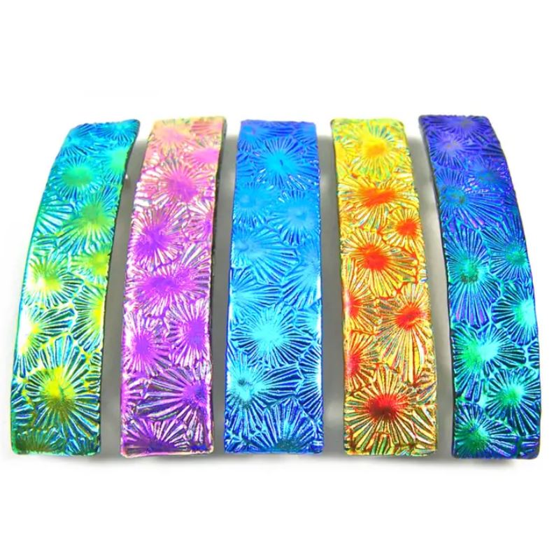 Dichroic glass barrettes handcrafted in assorted colors. The Florentine series features bright metallic iridescent hair clip slides. Dichroic colors shift and change as one moves, and in varied light. The colors POP! This pattern evokes varied interpretations... floral, fireworks, shell, snowflakes.