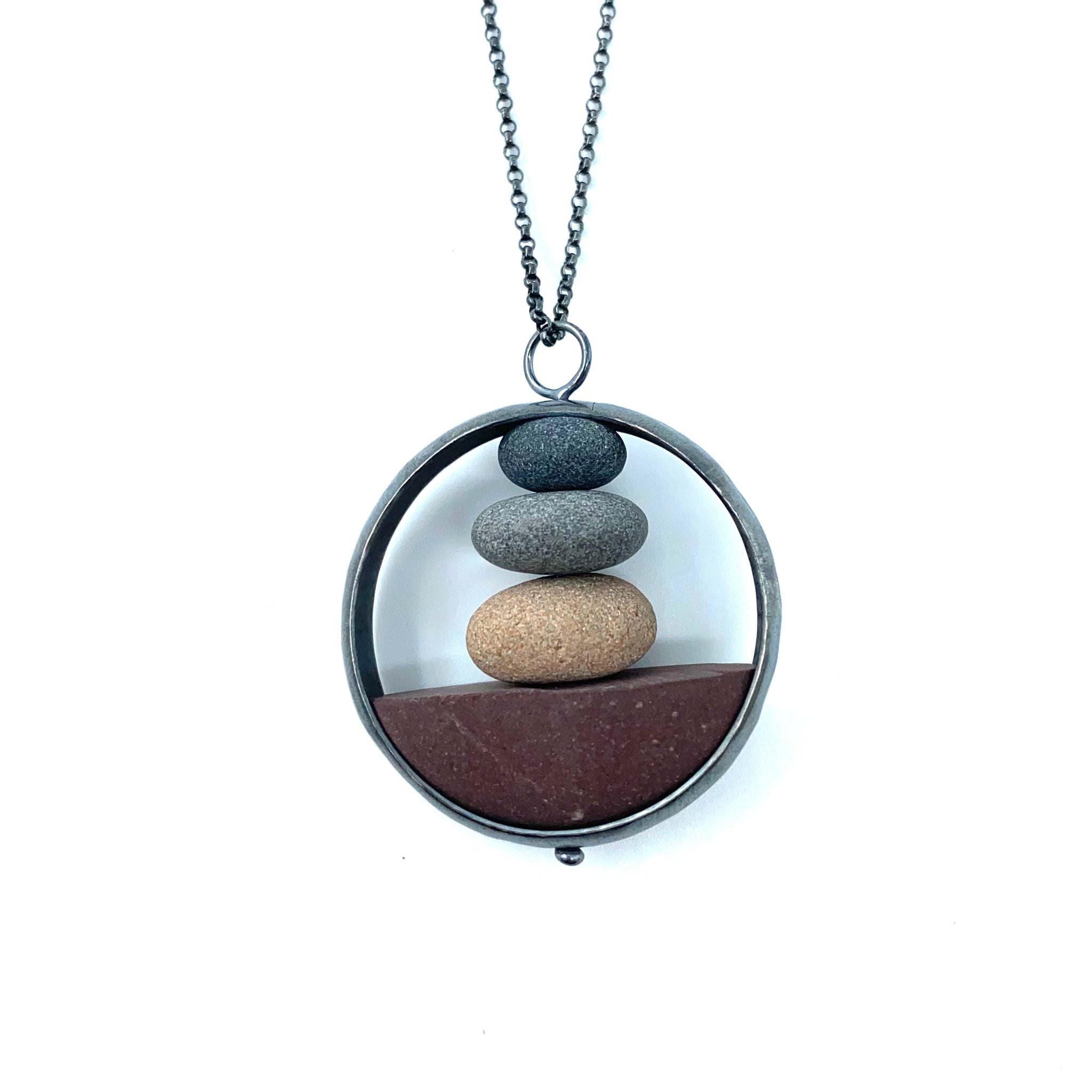 This unique pendant features a stack of lake stones in a silver dome. The pendant measures approximately 1.25" in diameter. Strung on an 18" oxidized sterling silver Rolo chain with a lobster clasp.