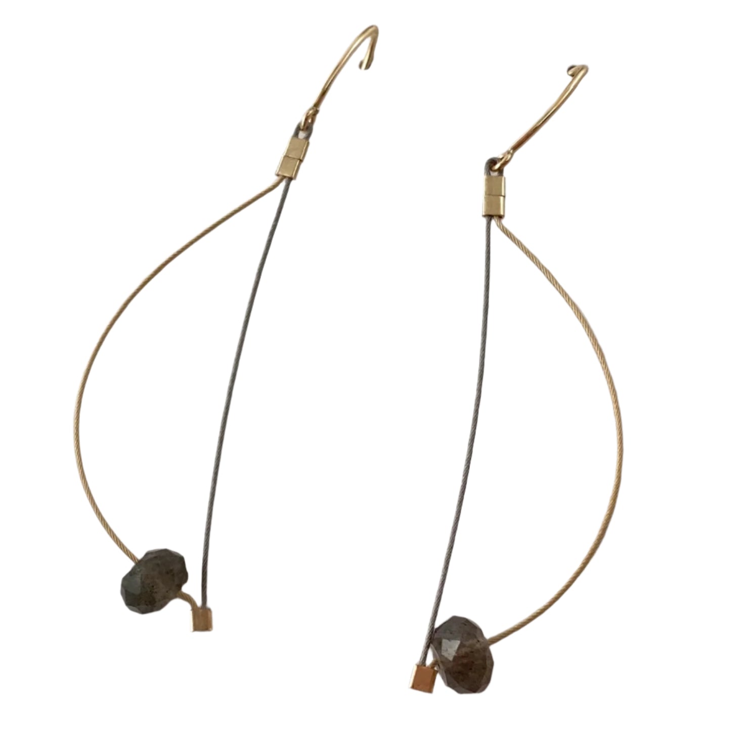 These earrings feature Labradorite stones with gold and steel two-tone cable.