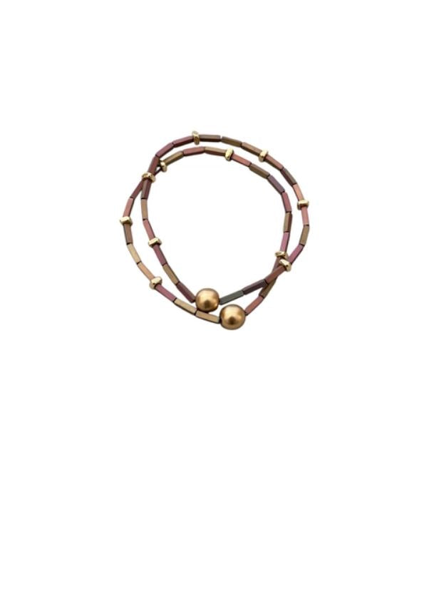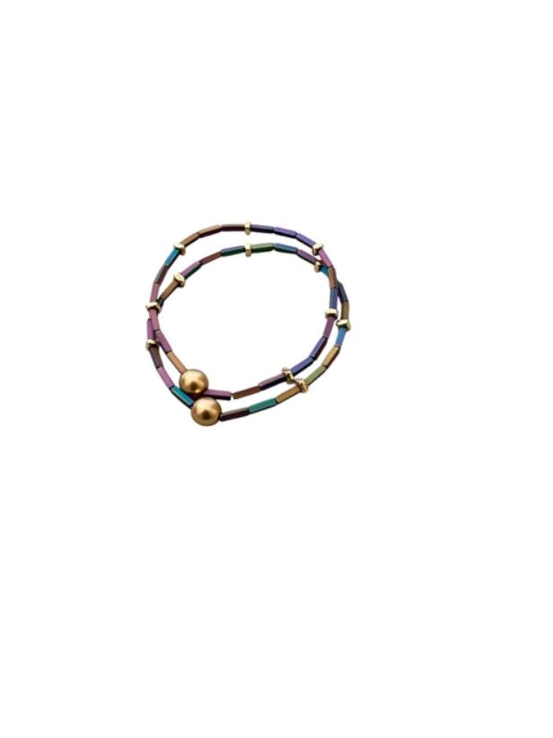 These bracelets are so beautiful... Stack as many colors you like! They are hand beaded on elastic with electroplated hematite and matte 18k gold plated hematite beads.