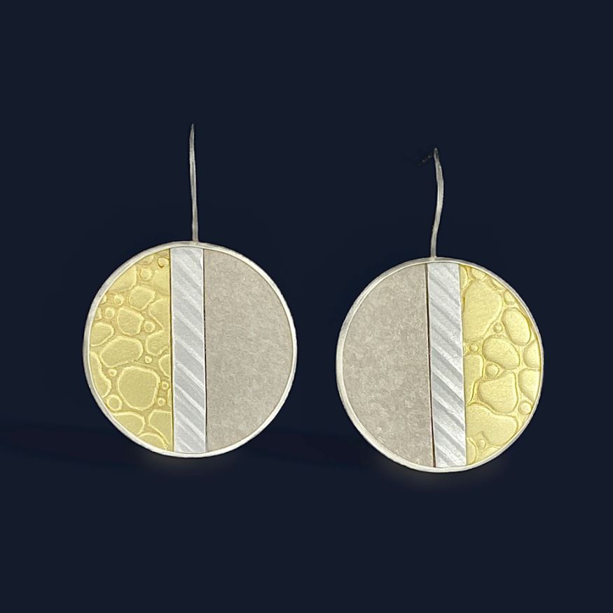 Textured titanium with roller printed aluminum and brass. Set in sterling silver. Sterling silver ear wires and safety hooks.
