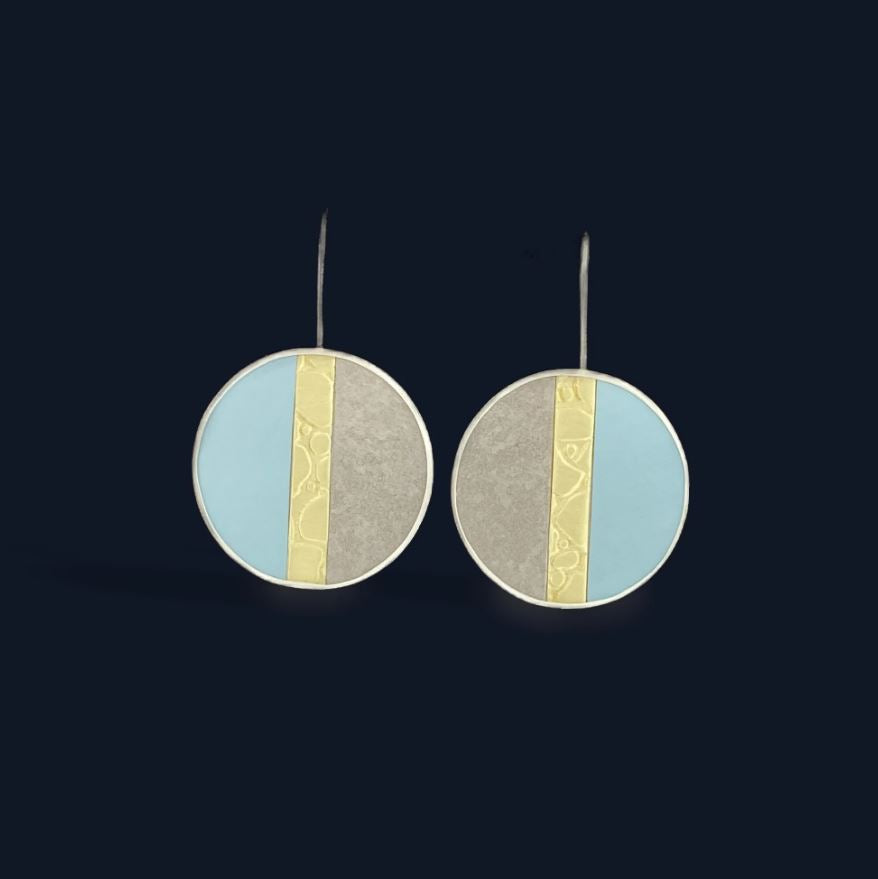 Textured titanium and brass with light blue anodized aluminum set in sterling silver. Sterling silver ear wires and safety catch.