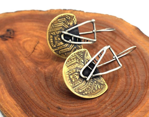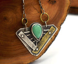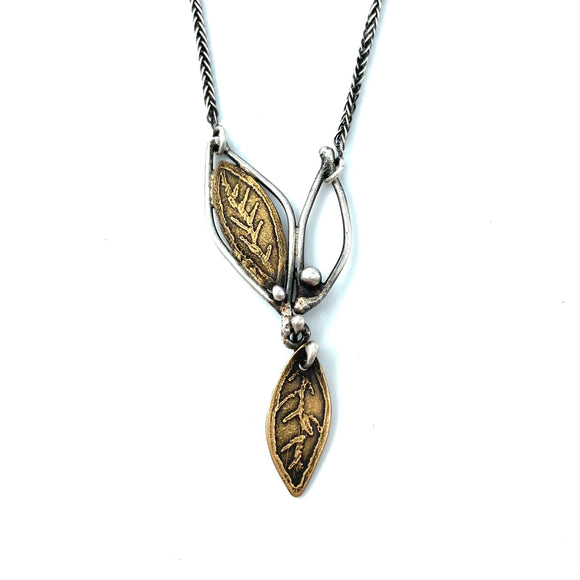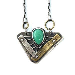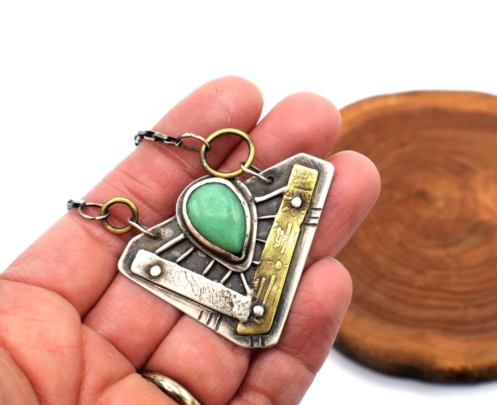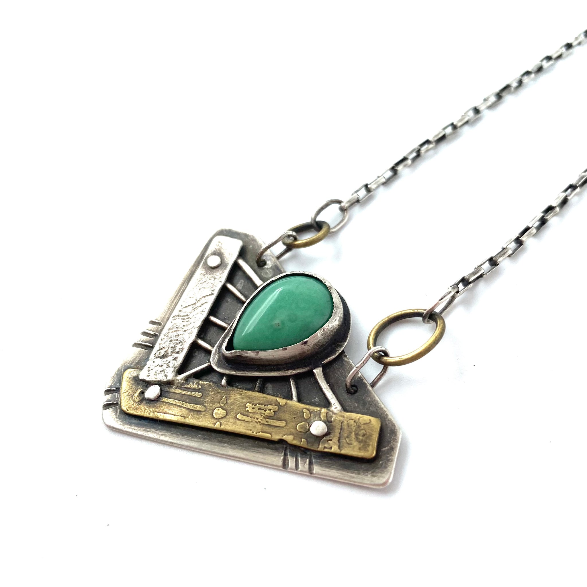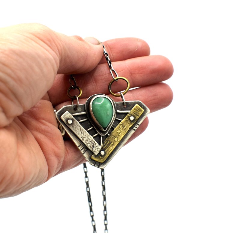 Make a bold statement with this one-of-a-kind, handcrafted necklace, blending rustic charm with modern bohemian elegance. The triangular pendant showcases artful layering of reticulated silver and etched brass, creating a dynamic, dimensional surface rich with texture and character.