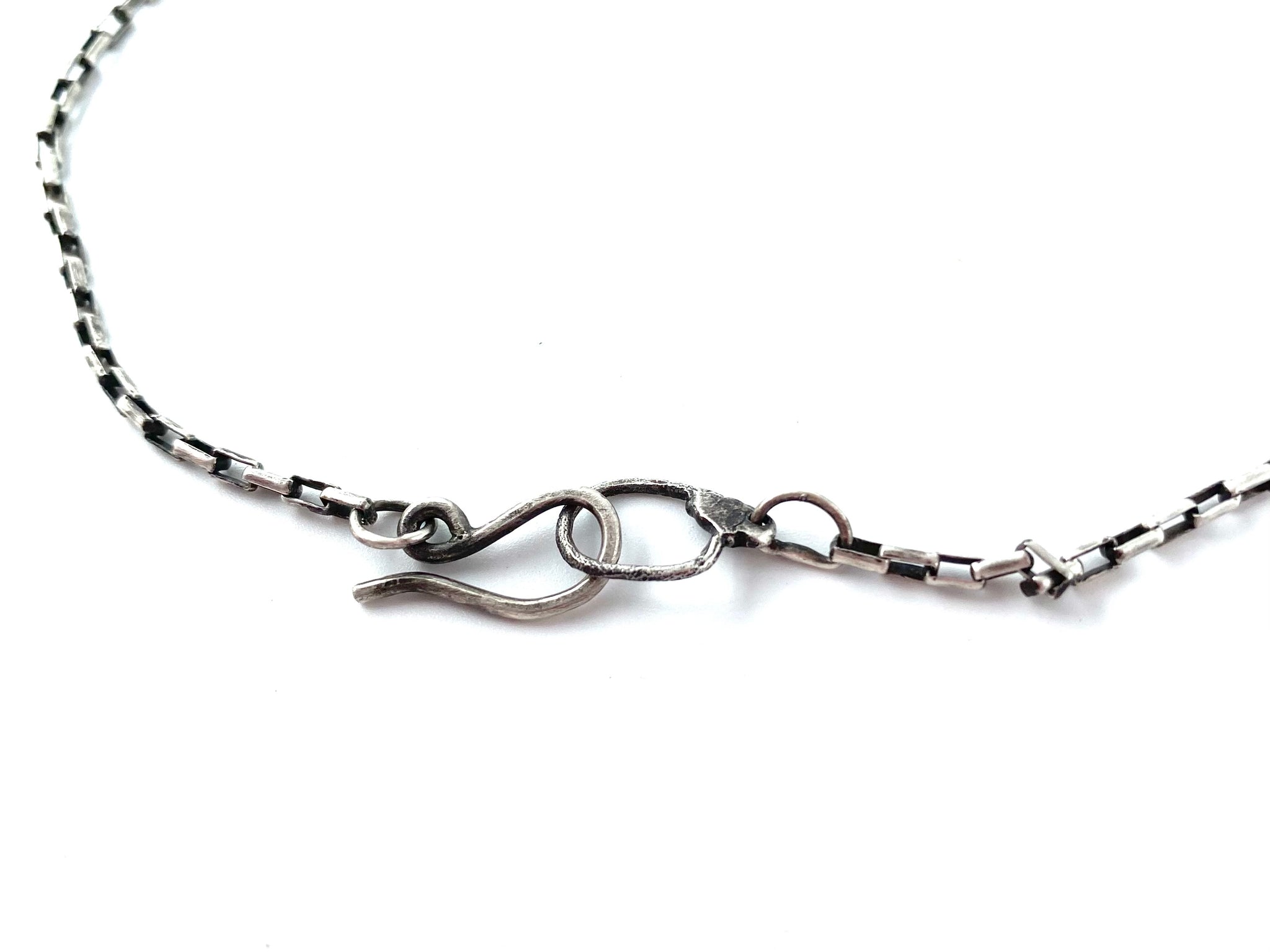 The pendant is approximately 1 5/8" long x 2" wide and hangs from a 16.5" silver chain with a handmade silver clasp.