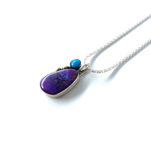 Sterling silver necklace with purple Mohave turquoise, bluebird turquoise and 14kt gold balls on a 20" sterling silver wheat chain.