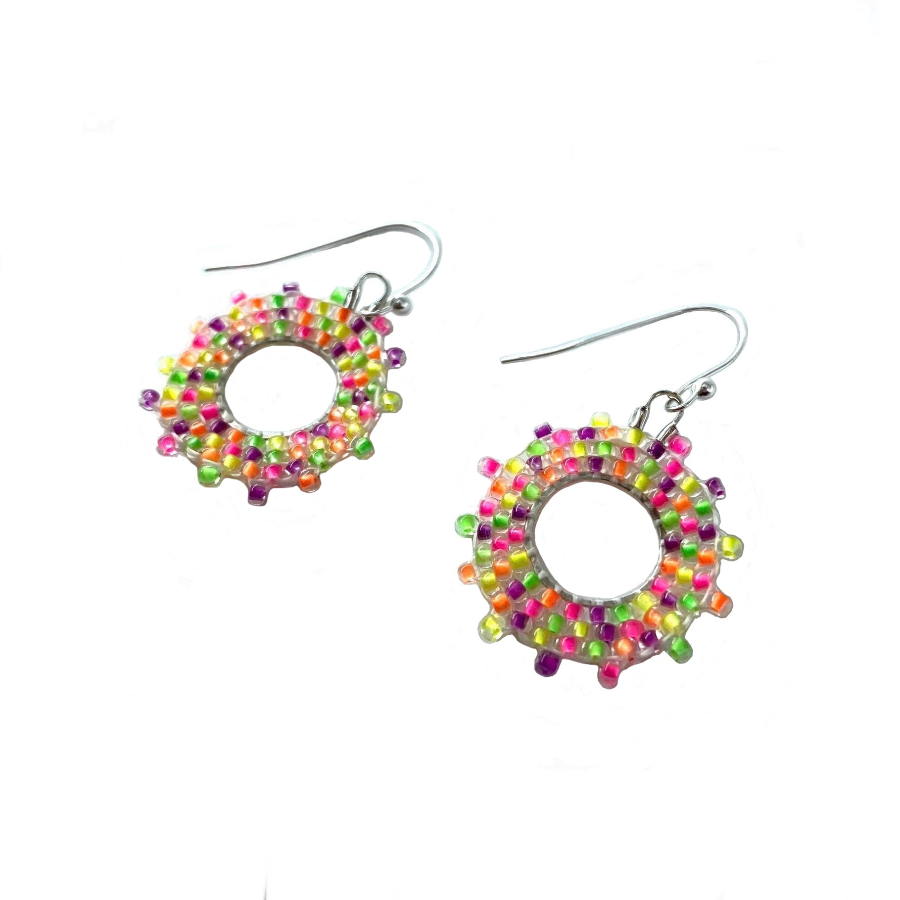 Materials: nylon thread, Czech glass seed beads, handmade Argentium rings, sterling silver wire guards, and sterling silver ear wires.