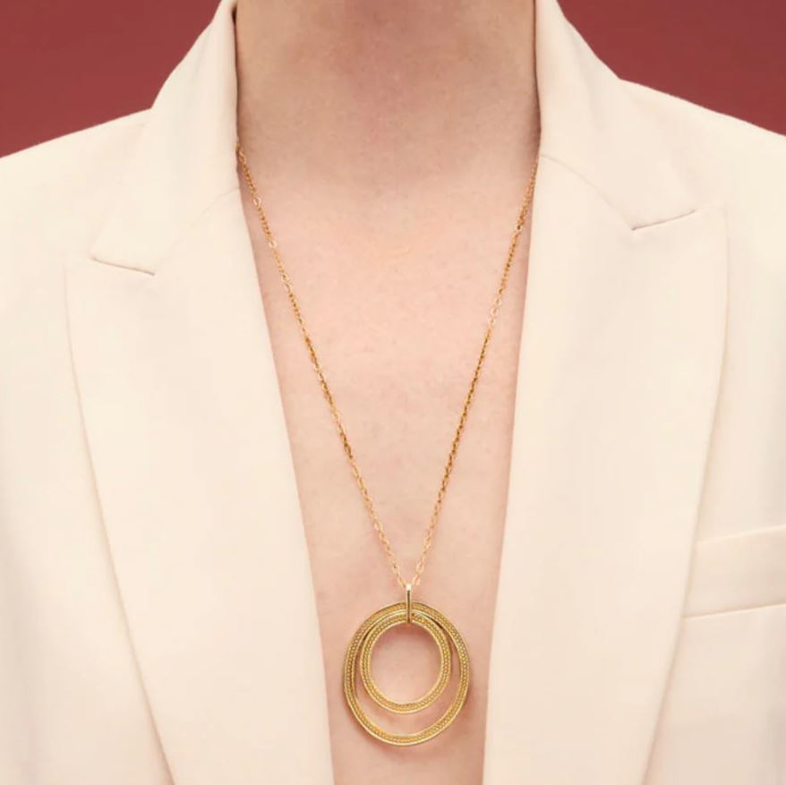 A new drop to complement the Orinoco line, this pendant features a double oval design, adorned with intricate filigree details in a zigzag pattern.