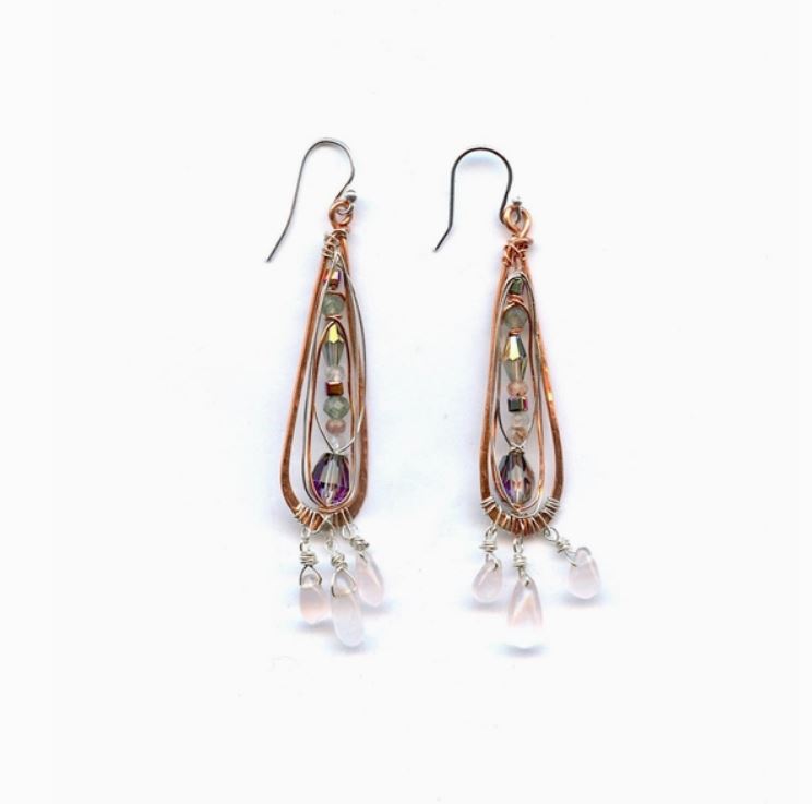 Hand formed copper drops are woven with webs of sterling silver that capture crystals and rutilated copper quartz faceted gemstones like a waterfall of cascading rose quartz drops. Finished with sterling silver French hooks.