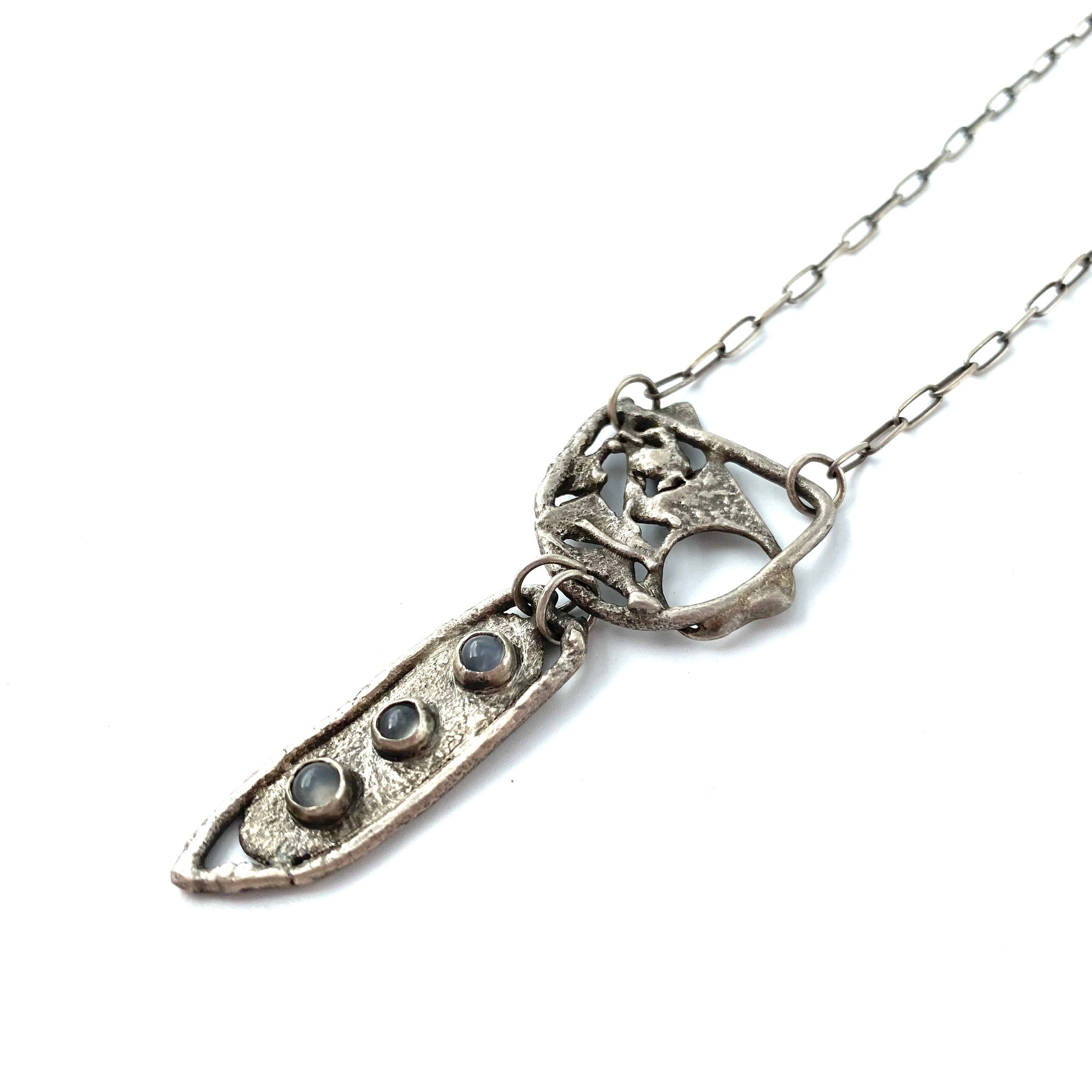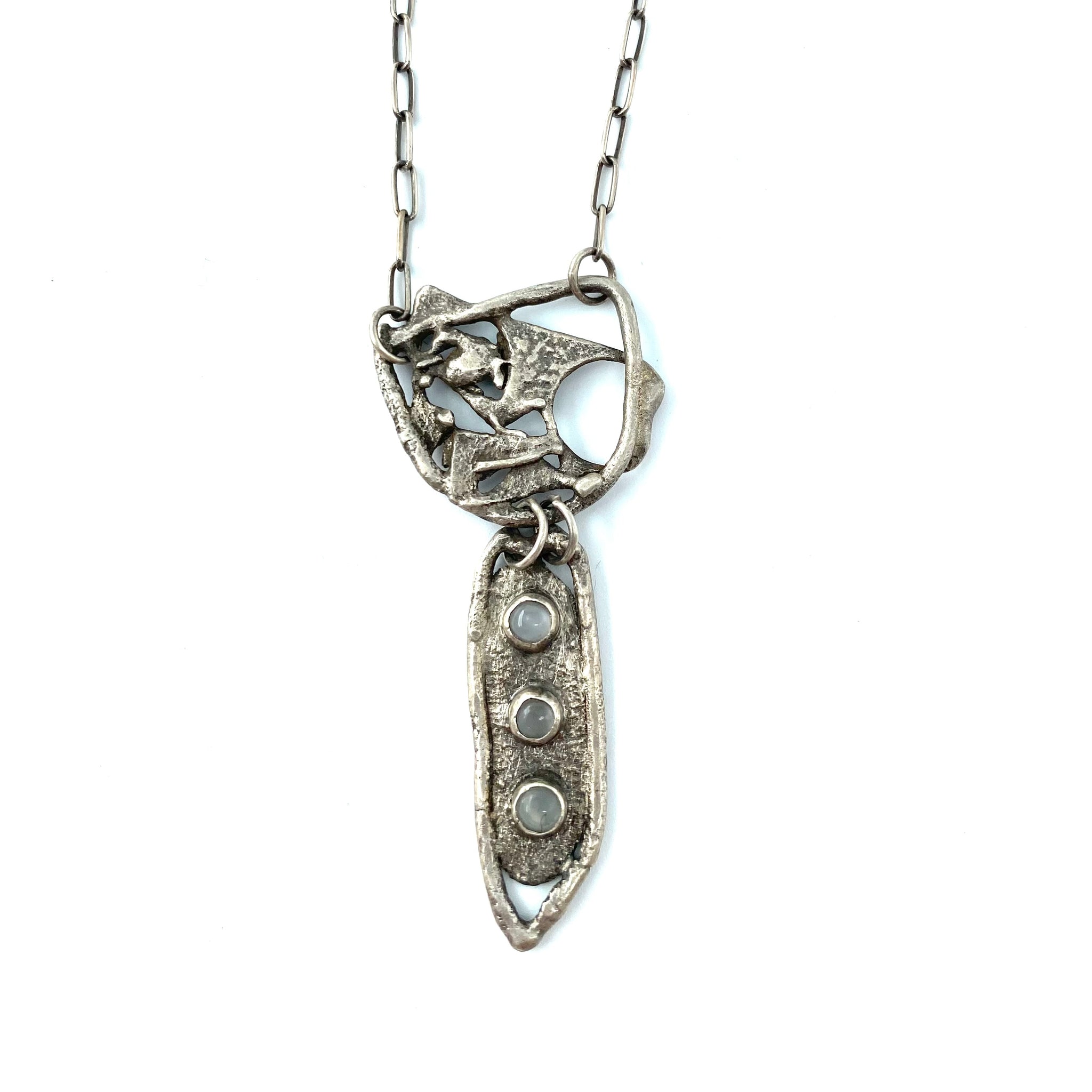 This one-of-a-kind necklace is made with smelted sterling silver and 3 bezel set moonstones. Organic shapes in silver are oxidized to emphasize the lovely textures. This lovely necklace is approximately 2.25" long and hangs from a 17.5" silver chain.
