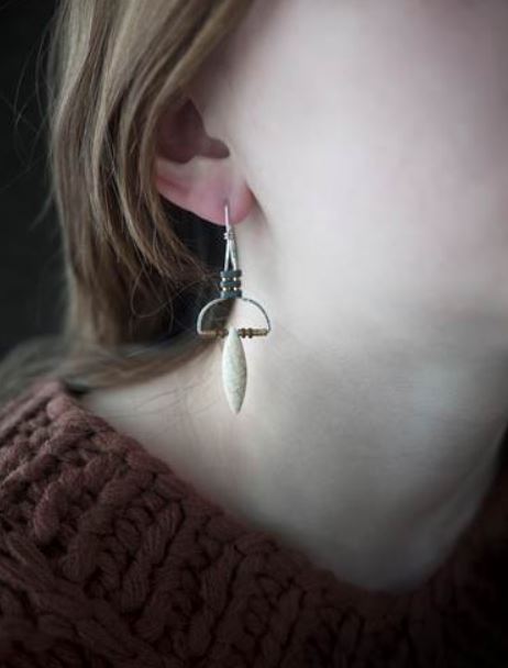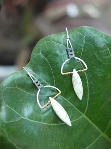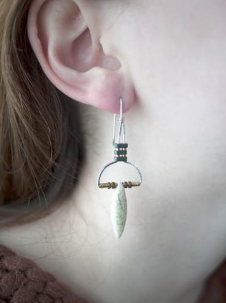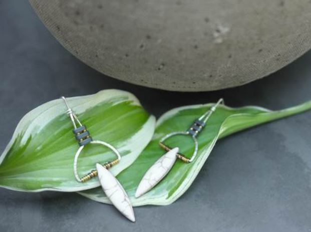 These earrings are made of wire and tiny hematite beads. The matte white howlite marquise shaped beads drop down from the metal. The wire has portions that are hammered to give the earring a unique combination of textures.