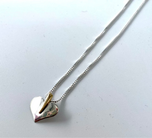 Sterling silver heart necklace with 14kt gold detail on an 18" sterling silver box chain.