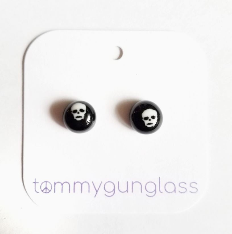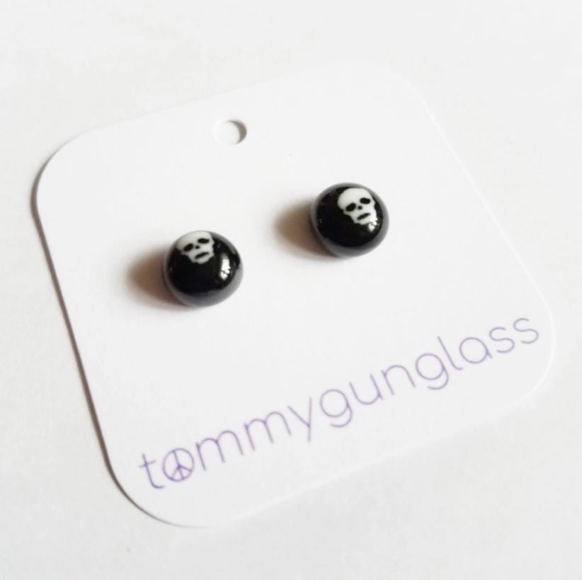 Handmade glass skull stud earrings come in blacks and white and may vary slightly in size. Perfect for Halloween or for your emo, goth, or punk types (all the best types!). Earrings are handmade, fused-glass on stainless steel posts.