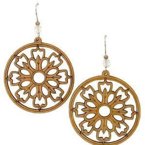 These earrings are handcrafted from furniture-grade veneers and hardwoods. These woods include Cherry, Maple, or Walnut. All of the wood is harvested from sustainable tree farms. The ear wires are made from surgical steel and have crystal bead accents. The wood piece is approximately 1" in diameter and the overall length is approximately 1.5".