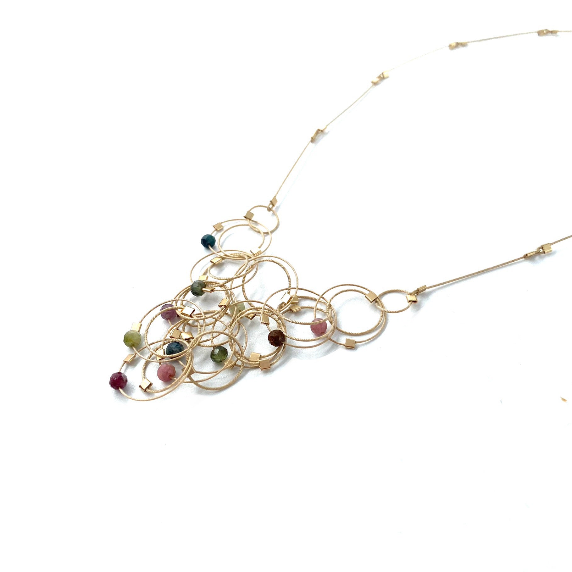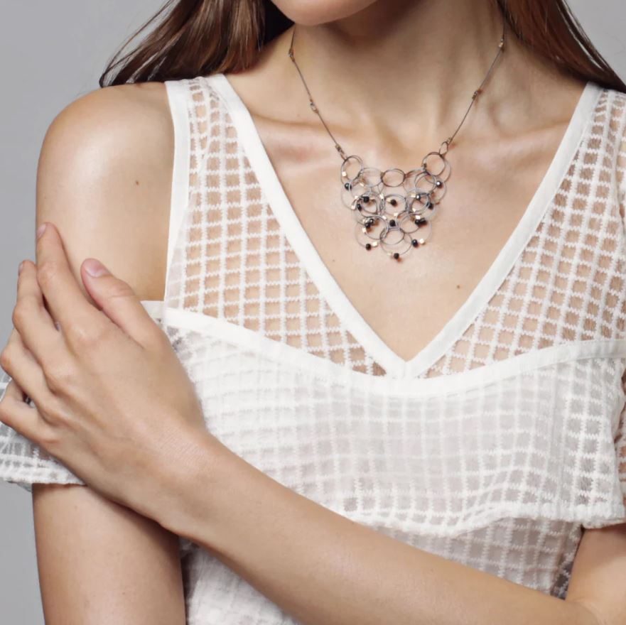The collections are modern and bold but balanced with a fine line that creates a lightweight, drape effect while worn. Each piece is hand-fabricated by trained artists and metalsmiths in Brooklyn, NY from miniature structural cabling inspired by the construction of suspension bridges and urban electrical pole landscapes.