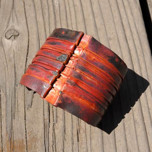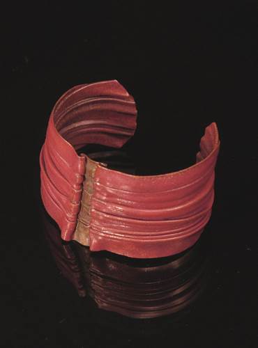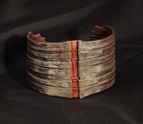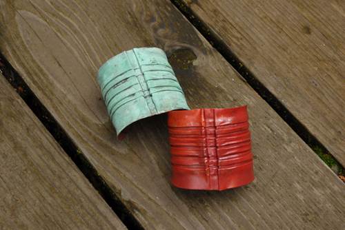 The Spine bracelet looks like shaped leather or rumpled cloth, but is in fact fold-formed copper. Each one is forged by hand from flat sheet and no two will be the same. Suitable for men's or women's wear, this design has versatility. Available in reds and browns natural to heated copper, as well as in a few of our patina colors. It will look great as casual daily wear, yet can enhance the most elegant ensemble.
