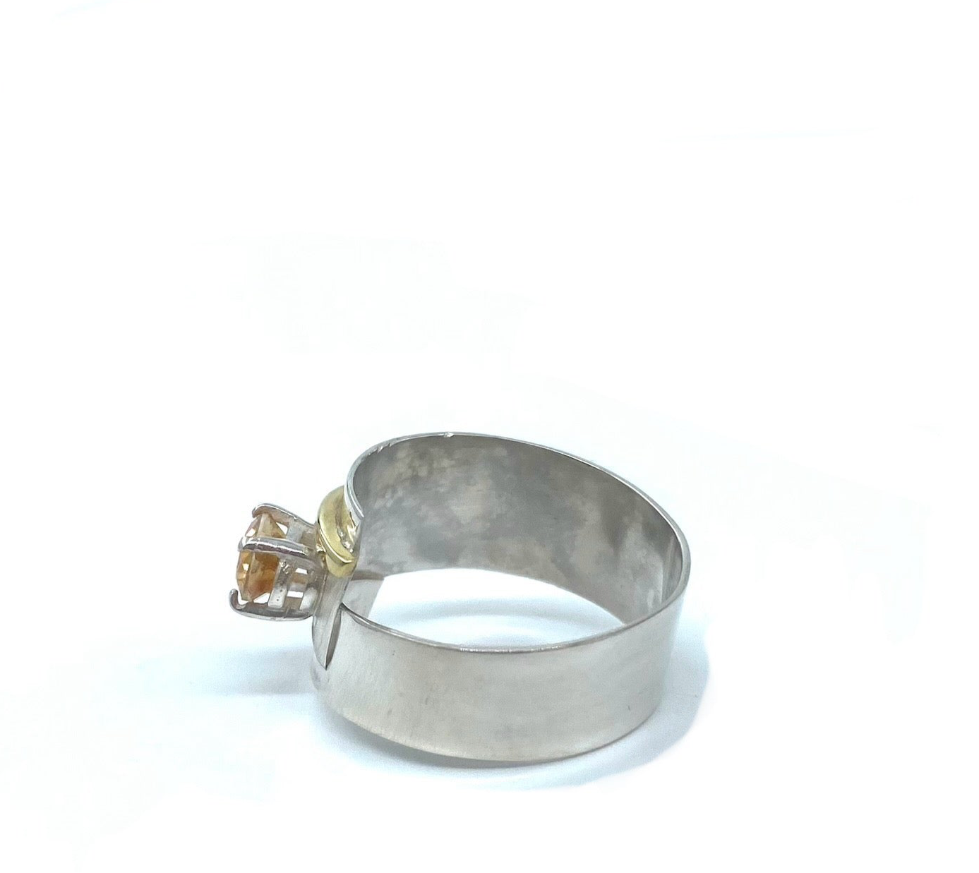 This ring is made of sterling silver and brass and features a Sunrise Topaz stone.
