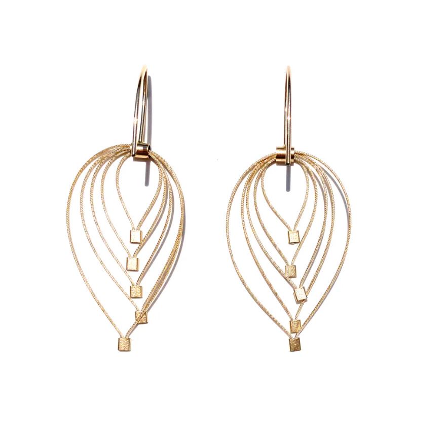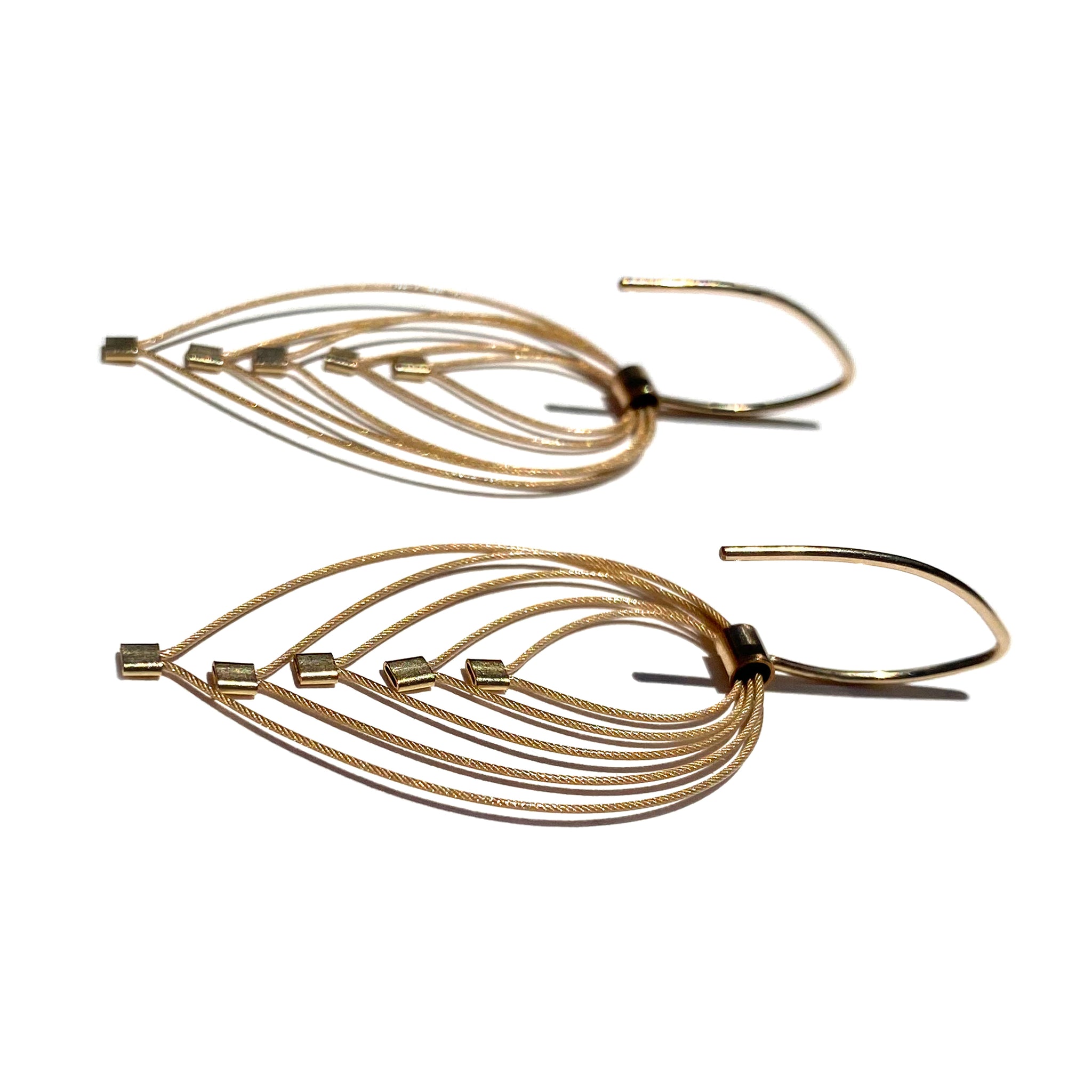 The collections are modern and bold but balanced with a fine line that creates a lightweight, drape effect while worn. Each piece is hand-fabricated by trained artists and metalsmiths in Brooklyn, NY from miniature structural cabling inspired by the construction of suspension bridges and urban electrical pole landscapes.