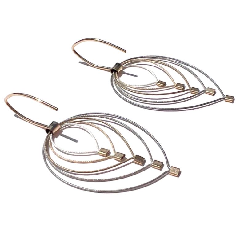 Flexible, light woven stainless steel mini cable finished with nylon for a smooth feel. Each piece is hand-finished with little accents of sterling silver and/or 14k gold-filled as well as a choice of semi-precious stones. Posts or hooks are 14k gold filled or sterling silver. Hypoallergenic materials. Travel-Friendly with metal memory (the pieces are collapsible and can return to shape after a crushing).