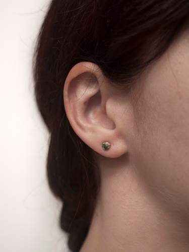 These sweet little stone stud earrings have sparkle and pop despite their very tiny size. Perfect for everyday wear! Made with wire and tiny stone beads made of green spot Jasper. The wire is hammered to give the earring a unique combination of textures.