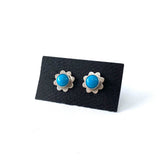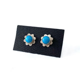 Sterling silver flower shaped post earrings with bezel set bluebird turquoise.