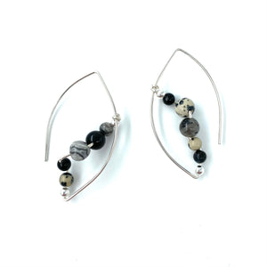These earrings are made with sterling silver, black onyx, and Dalmatian Jasper.