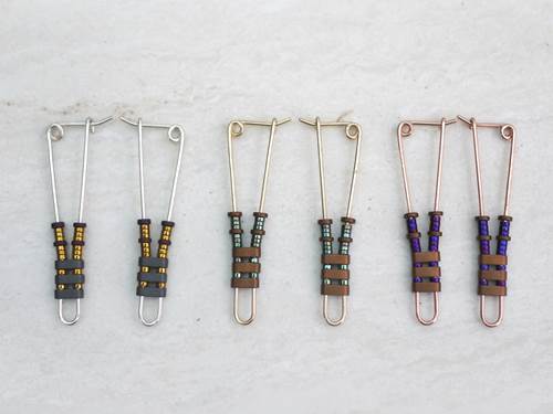 These earrings are made of wire and tiny hematite beads. The wire has portions that are hammered to give the earring a unique combination of textures.