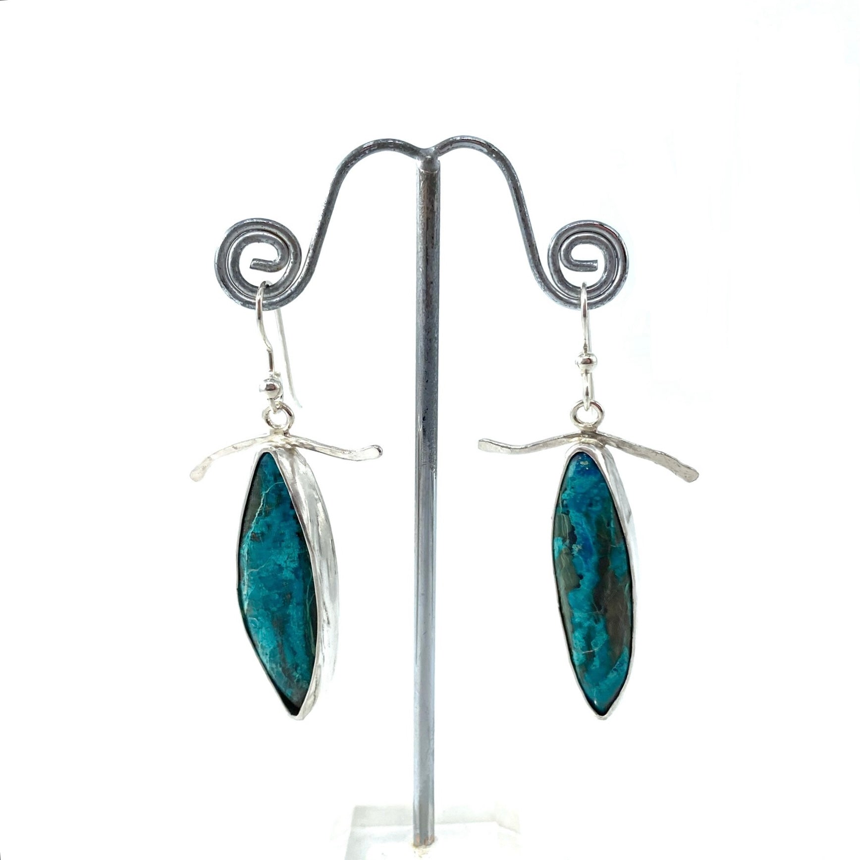 These stunning earrings are made of fabulous Chrysocolla Malachite that are set in fine silver bezels and backs with sterling silver toppers.