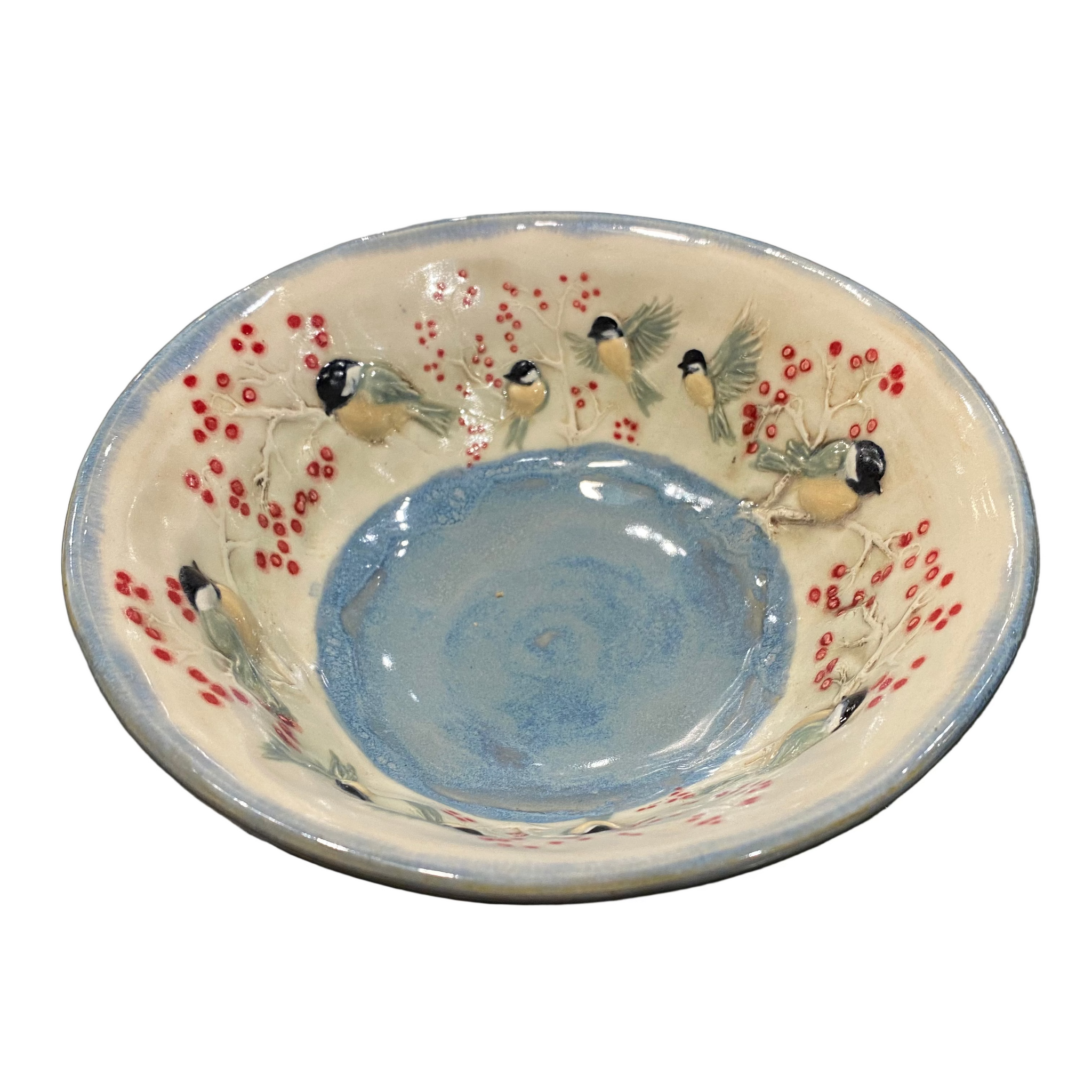 Hand thrown porcelain bowl with bass-relief image of chickadees and red winter berries impressed in the clay with a unique hand-carved roulette. Handmade by Jennifer Stein of Ramsey, New Jersey.