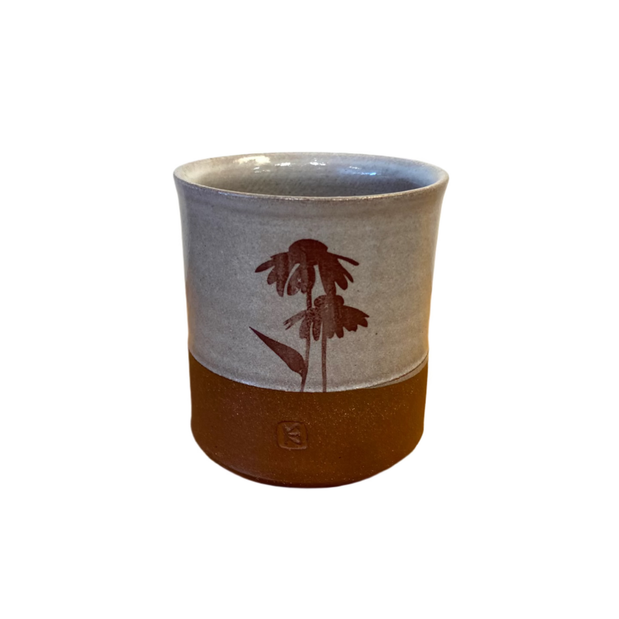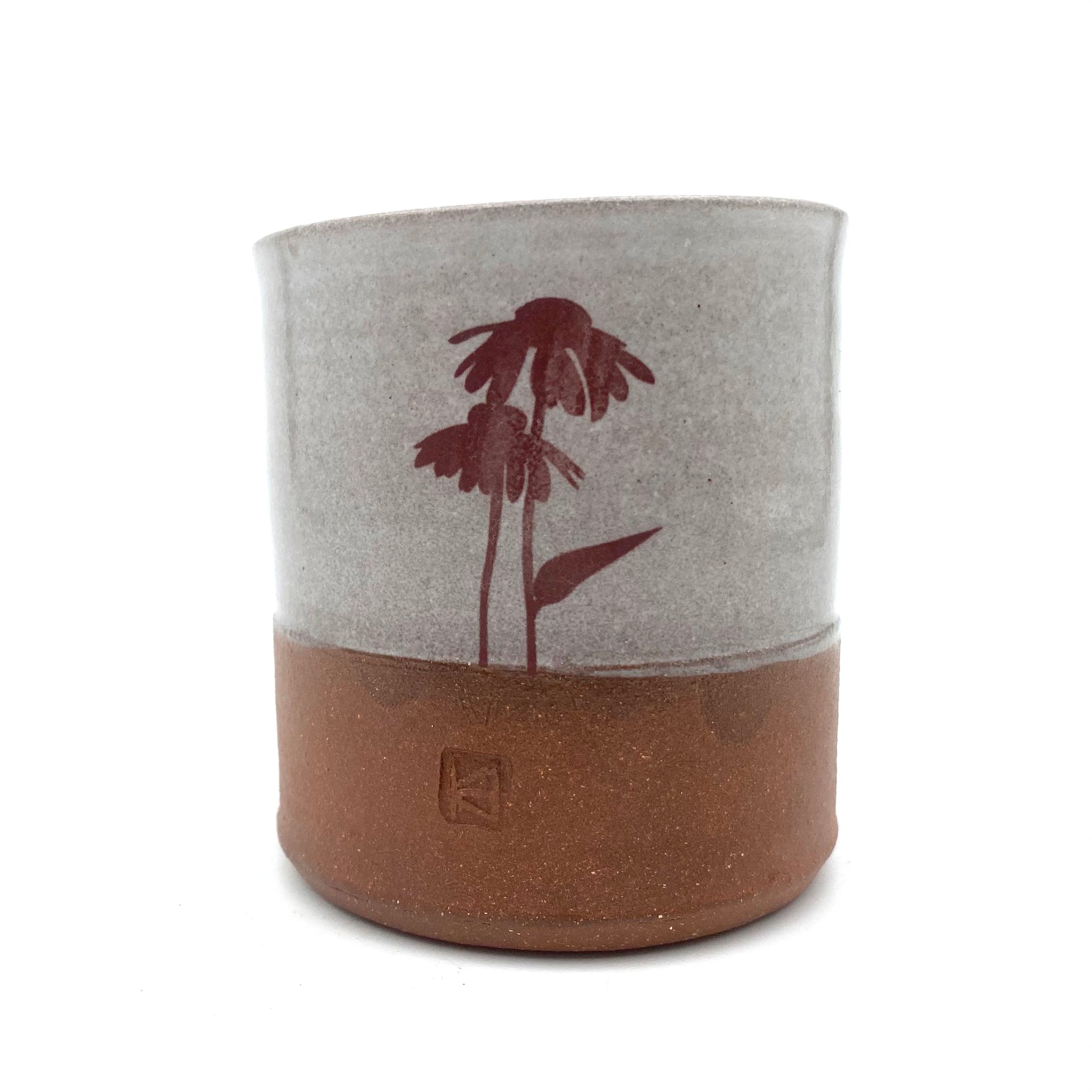 It has a Coneflowers design that has been fired into the glaze. The bottom section is left unglazed, and the matte raw red clay complements the smooth glazed surface of the top and interior of the cup. It also has a Coneflowers design on the bottom of the cup.