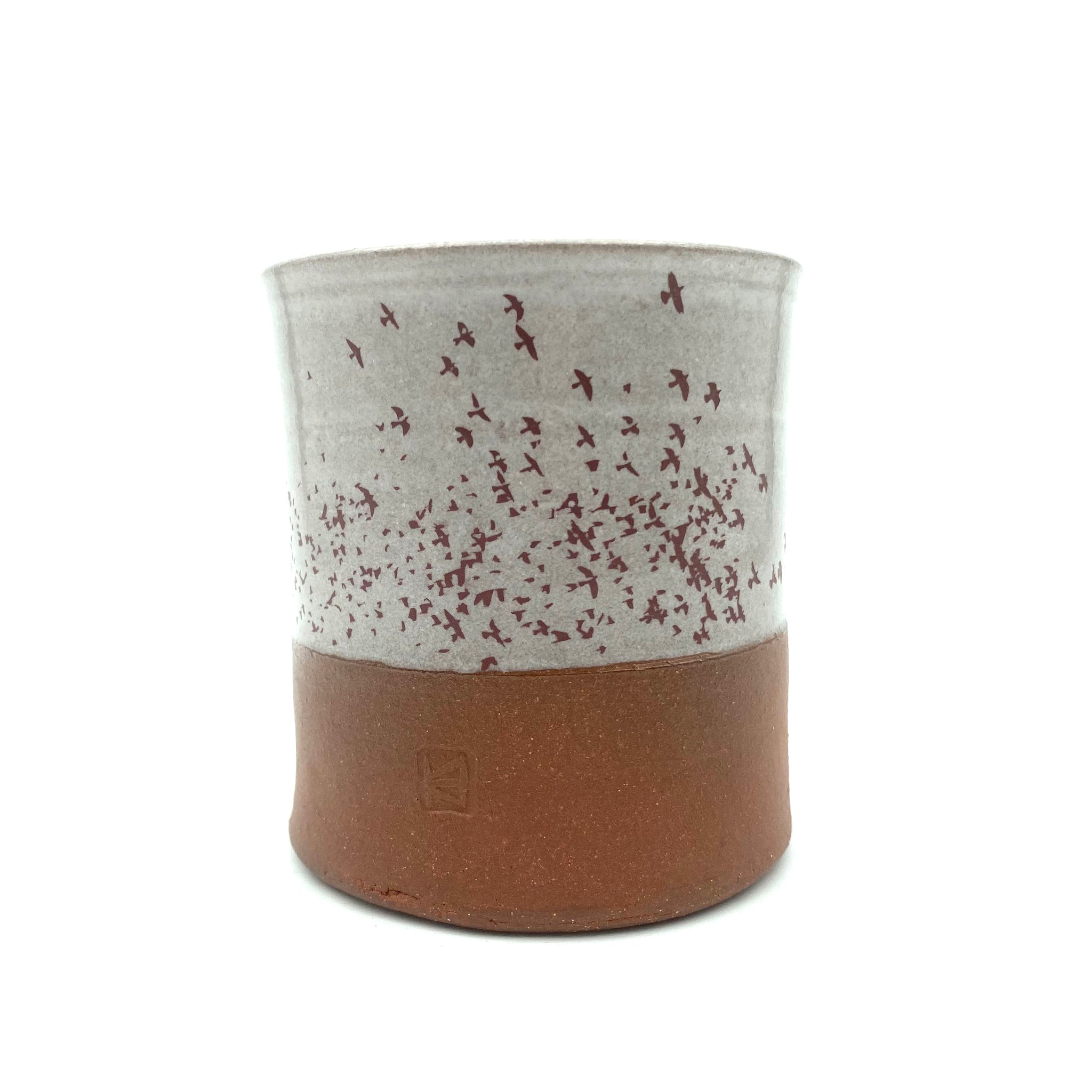 It has a Flock of Birds design that has been fired into the glaze. The bottom section is left unglazed, and the matte raw red clay complements the smooth glazed surface of the top and interior of the cup. It also has a Flock of Birds design on the bottom of the cup.